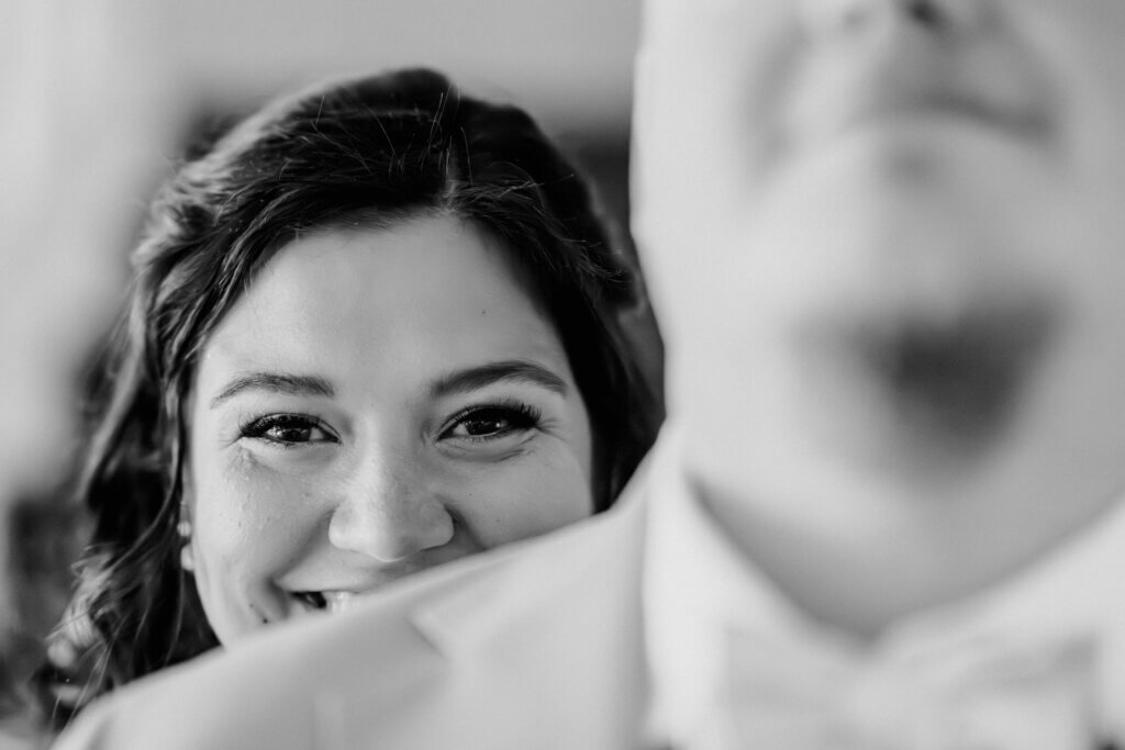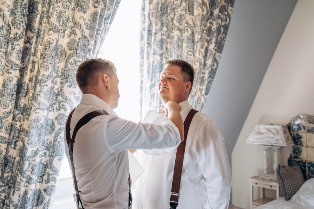 Ja, und genau da liegt oft ein unterschätzter Teil der Reportage, weil dort Emotionen sehr nah und ehrlich sind. Damit es ruhig wirkt, hilft ein aufgeräumter Raum und ein bisschen Licht, das weich fällt, mehr braucht es meistens nicht. Wenn du dir wünschst, dass dieser Teil nicht nach Stress aussieht, reicht oft schon, ein paar Dinge aus dem Hintergrund zu nehmen, die sonst ablenken. Ich arbeite dabei so, dass du dich nicht beobachtet fühlst, sondern dich auf dich konzentrieren kannst. Wenn du als Paar planst, hilft euch diese Phase oft auch emotional, weil der Tag langsam startet und nicht sofort ins Vollgas springt. Und genau diese Ruhe gibt der gesamten Gut Pronstorf Hochzeit später einen stimmigen Anfang in der Galerie.